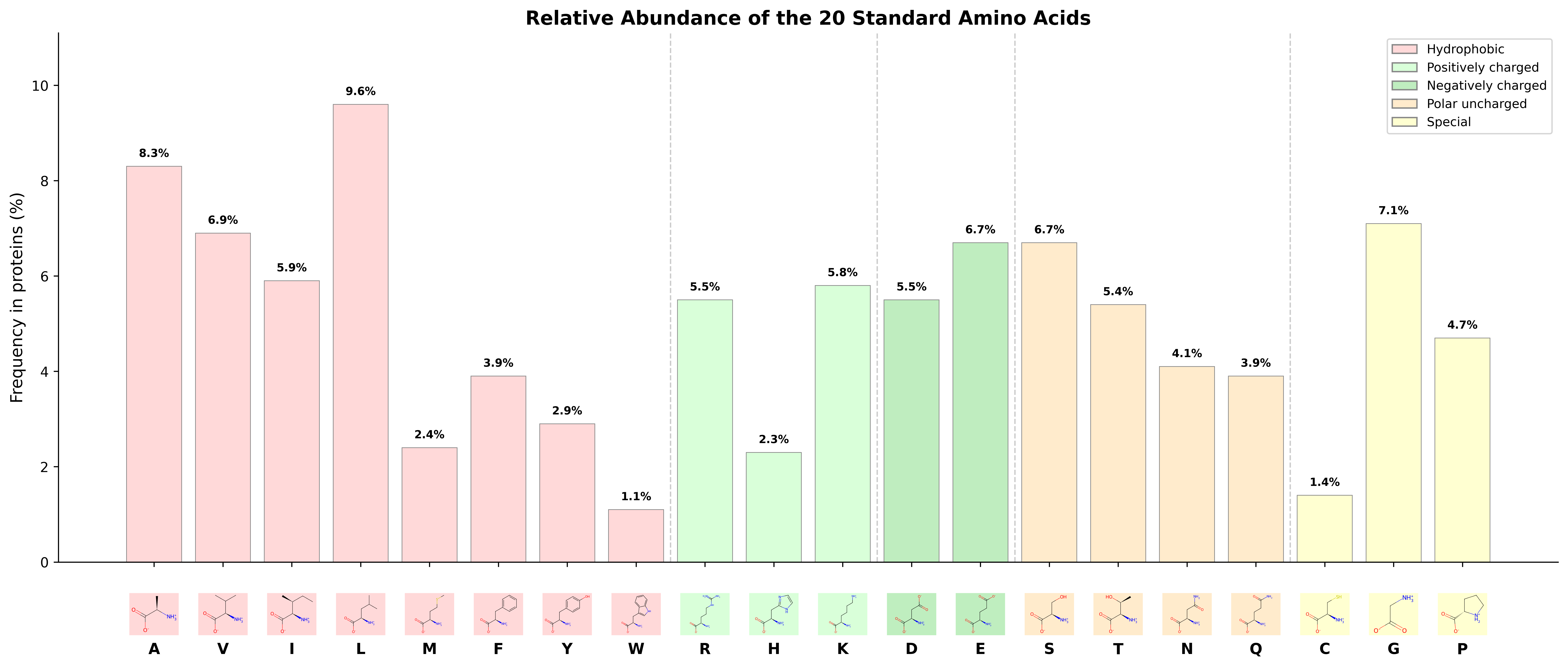 When you Google “amino acids,” one of the first images you’ll see is this colorful diagram, showing the skeletal formulas of twenty molecules grouped by the chemical character of their side chains. Throughout many biochemistry courses, I have found myself memorizing this exact chart.