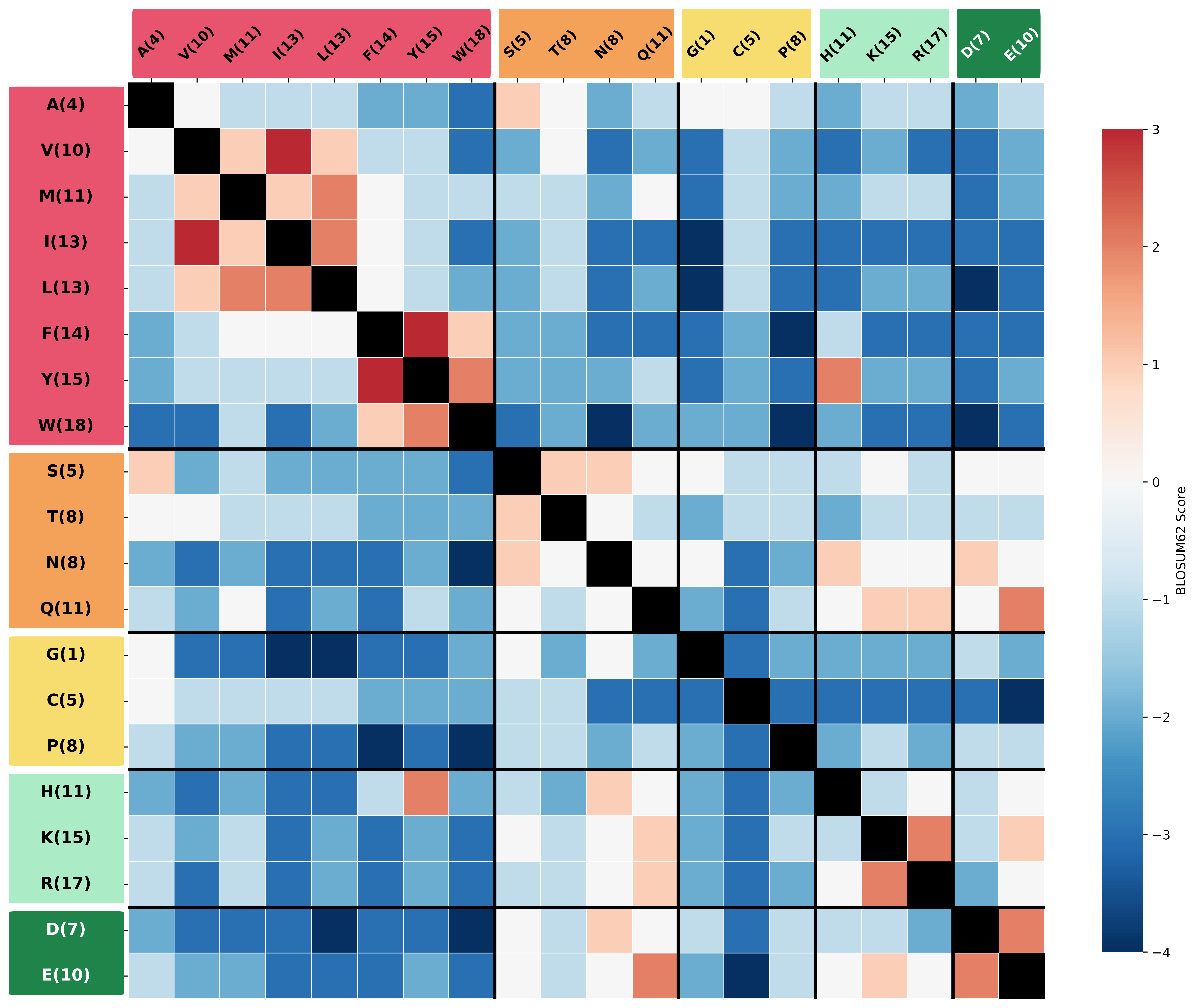 A few patterns jump out. Within each property group, most substitutions score near zero or positive, especially between amino acids of similar size: the branched-chain hydrophobic residues (Val, Ile, Leu) interchange readily, as do Asp and Glu (the two negatively charged residues) and Lys and Arg (two of the three positively charged ones). The hydrophobic aromatic residues (Phe, Tyr, Trp) also cluster together. Between groups, the scores turn negative: substituting a small hydrophobic residue for a charged one almost never happens in conserved positions, because the physicochemical mismatch is too large.