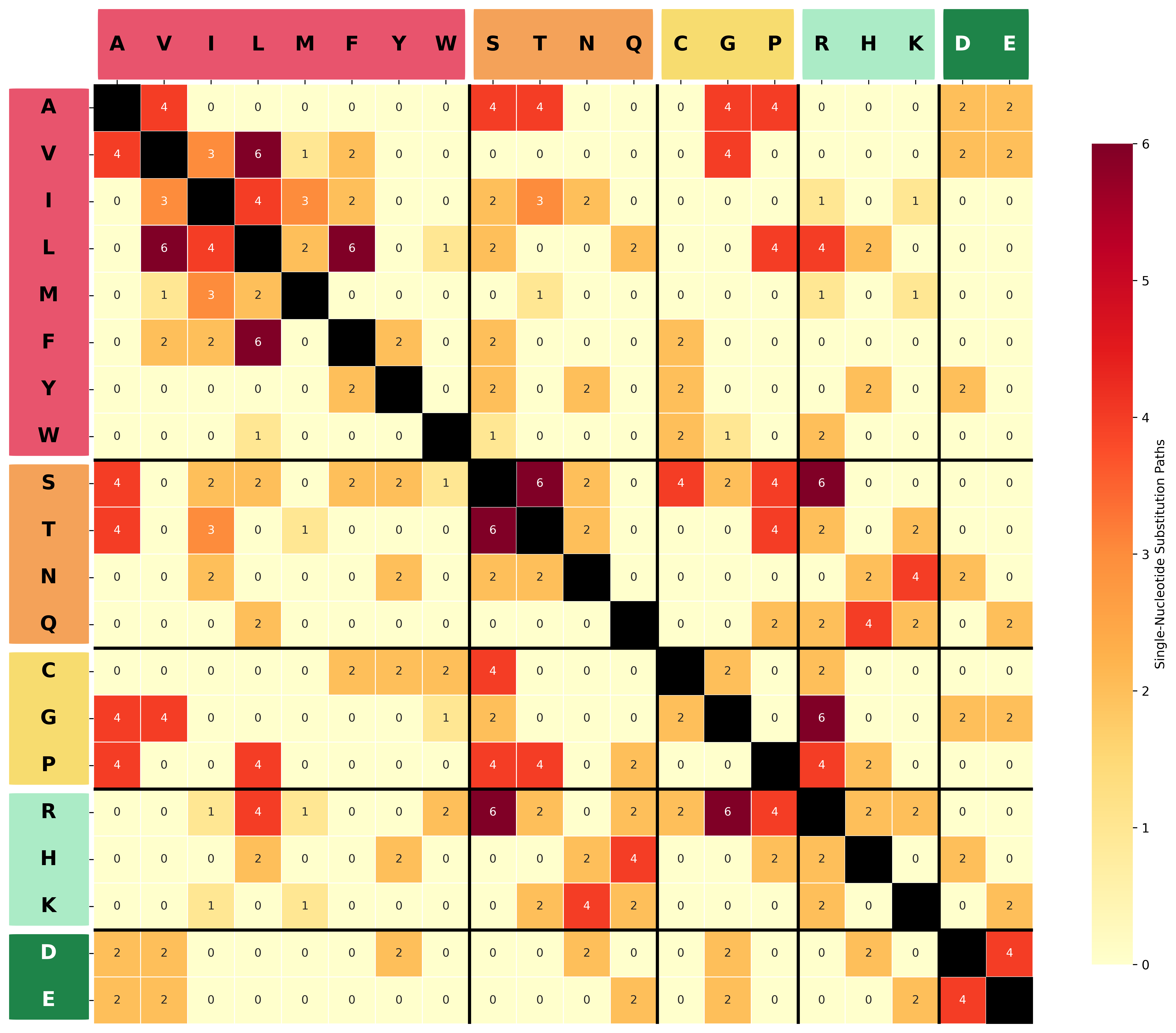 We can quantify this directly. For each pair of amino acids, we can count how many ways a single-nucleotide substitution in any of their codons converts one into the other. This gives us a 20×20 connectivity matrix that reflects which amino acids are “mutational neighbors.”